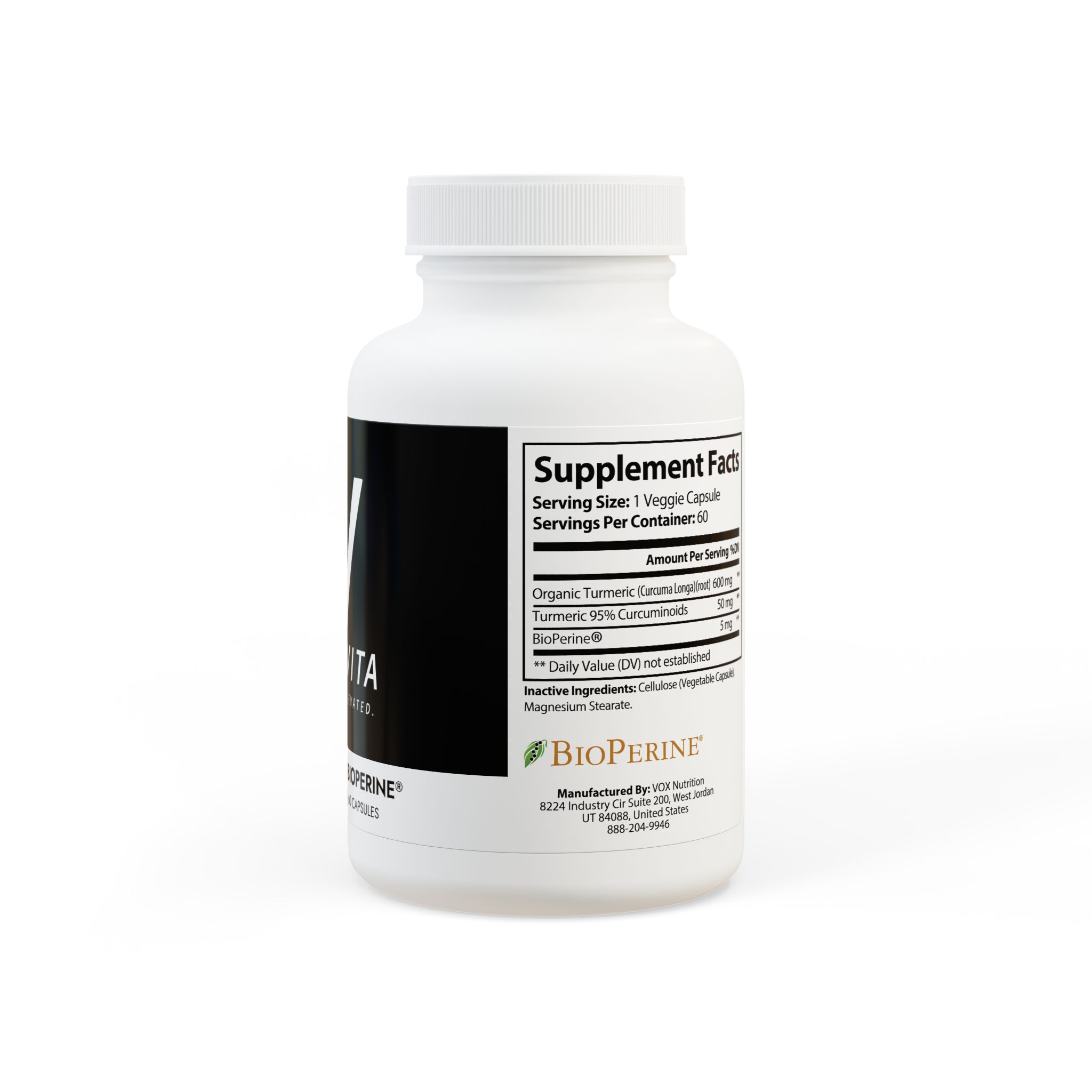 Ingredients: Organic Turmeric (Curcuma Longa)(root), Turmeric 95% Curcuminoids, BioPerine. Inactive Ingredients: Cellulose (Vegetable Capsule), Magnesium Stearate.